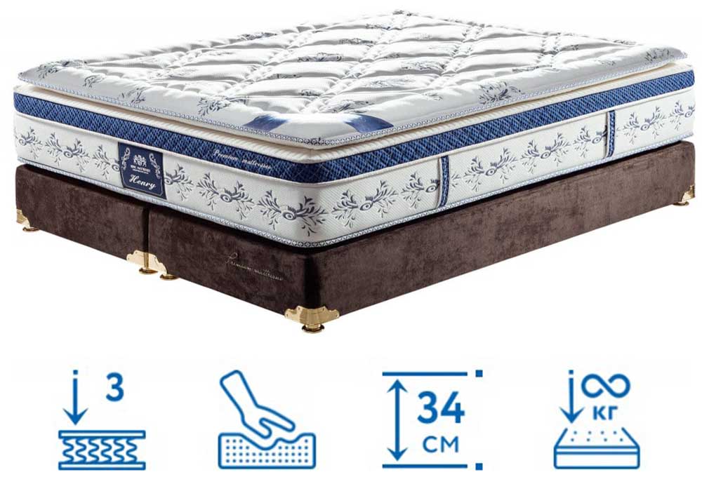 Односторонний матрас King Mattresses Henry/Генри купить в интернет-магазине Матрас ТВ заинтересованы любители комфортных спальных приспособлений. Модель органично сочетает в себе роскошь и лаконичный дизайн. Конструктивной основой служит модуль Chess Assembly Pocket с потрясающим ортопедическим эффектом.