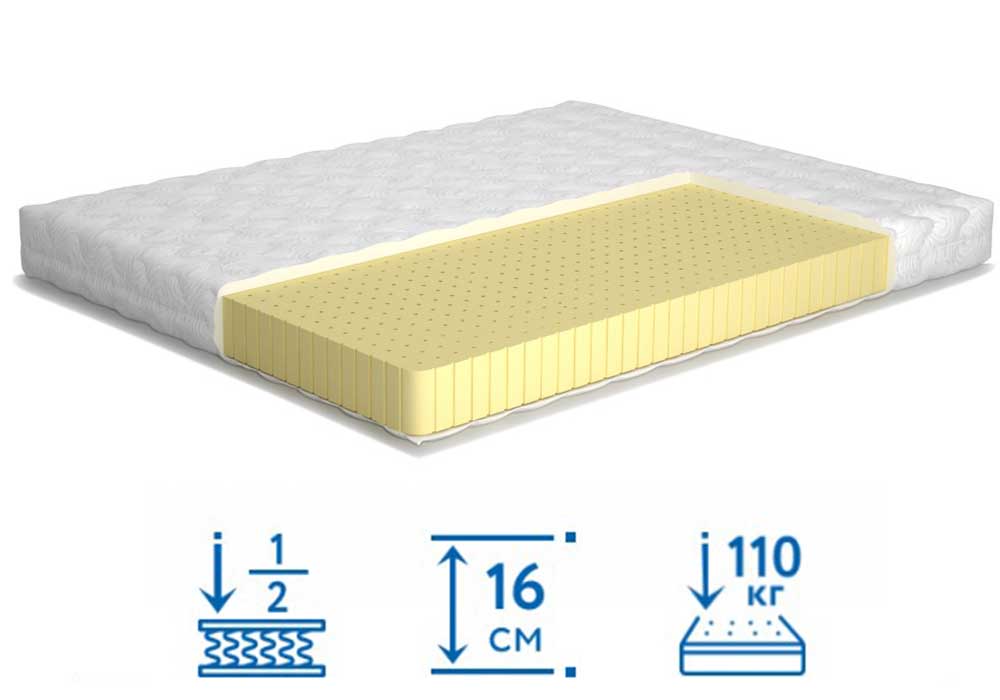 Матрас Latex/Латекс купить в интернет-магазине Матрас ТВ разумно, если требуется спальное приспособление с основой из латекса. Двухстороннее изделие с варьируемой жесткостью высотой 16 см способно выдержать вес до 110 кг. Достоинства изделия оценят любители мягких приспособлений для постоянного ночного сна.