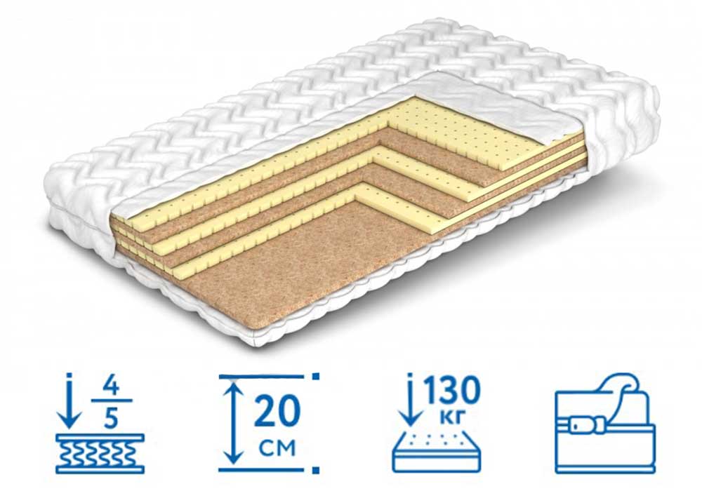 • Кокосовая койра. Плита из смеси растительных волокон и латекса обладает отменными ортопедическими характеристиками, не способна удерживать пыль и влагу, прочна и безопасна для здоровья.