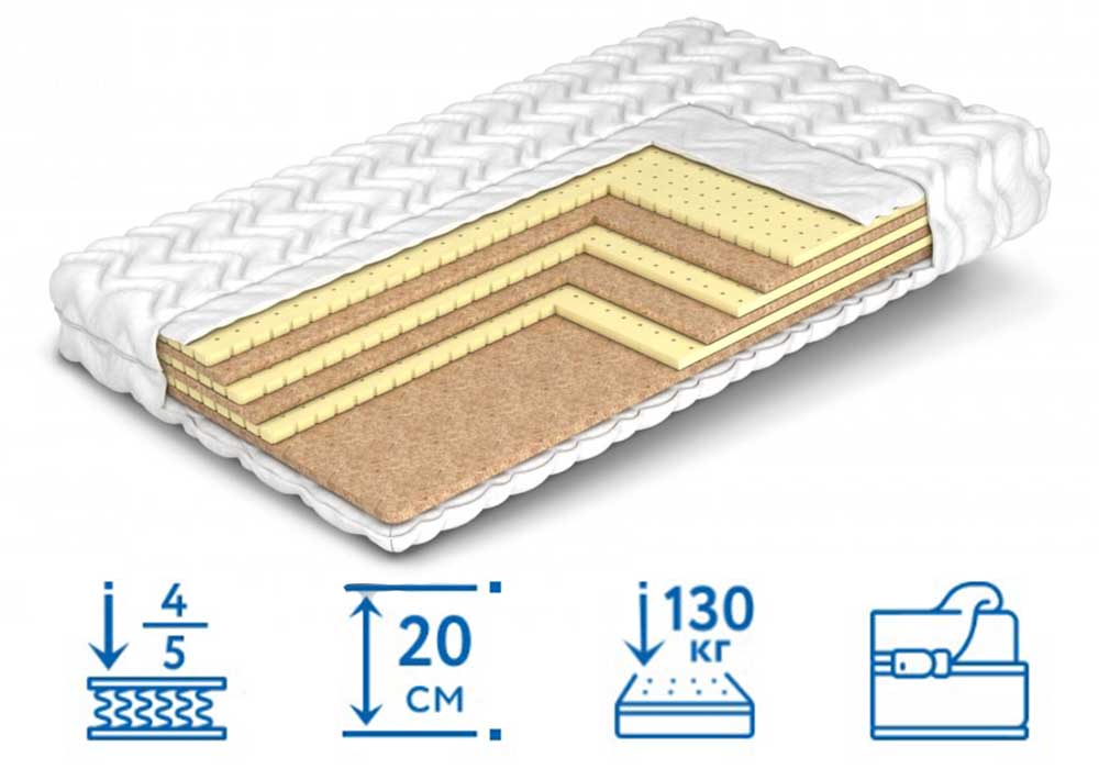 • Кокосовая койра. Плита из смеси растительных волокон и латекса обладает отменными ортопедическими характеристиками, не способна удерживать пыль и влагу, прочна и безопасна для здоровья.