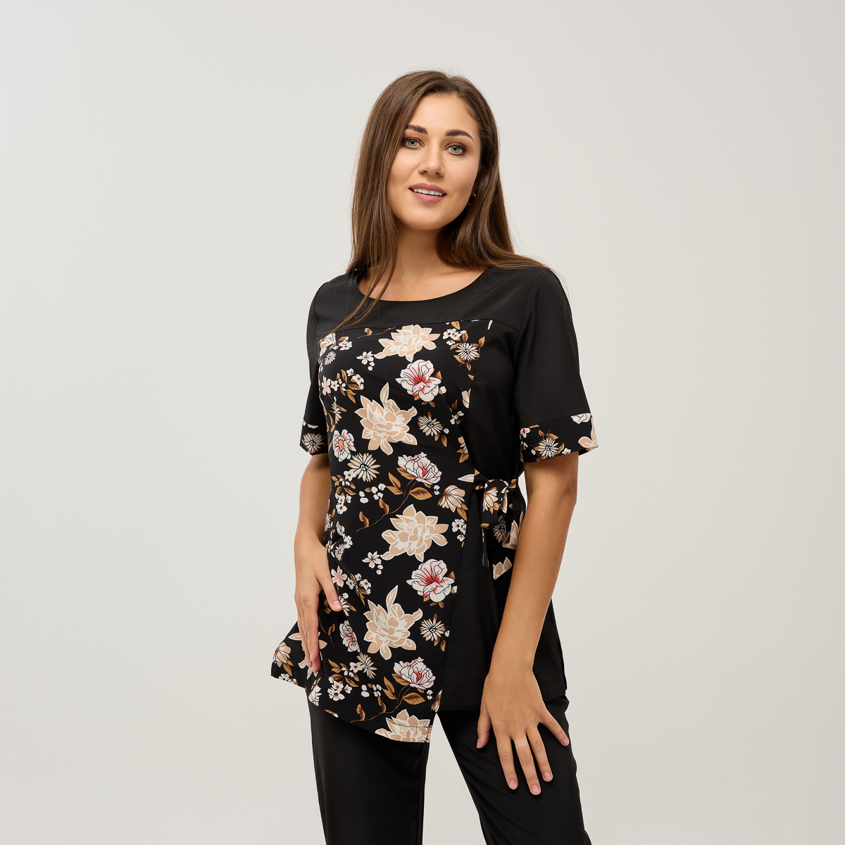 Ребекка - костюм, який миттєво додасть вишуканості вашому образу! Пошитий з неймовірно м'якої та легкої тканини. Унікальний крій блузки підійде для будь-якого типу фігури та підкреслить її жіночу привабливість. Квітковий малюнок додасть свіжості, а скорочені, легко облягаючі брюки з кишенями акцентують увагу на вишуканості ваших ніг.