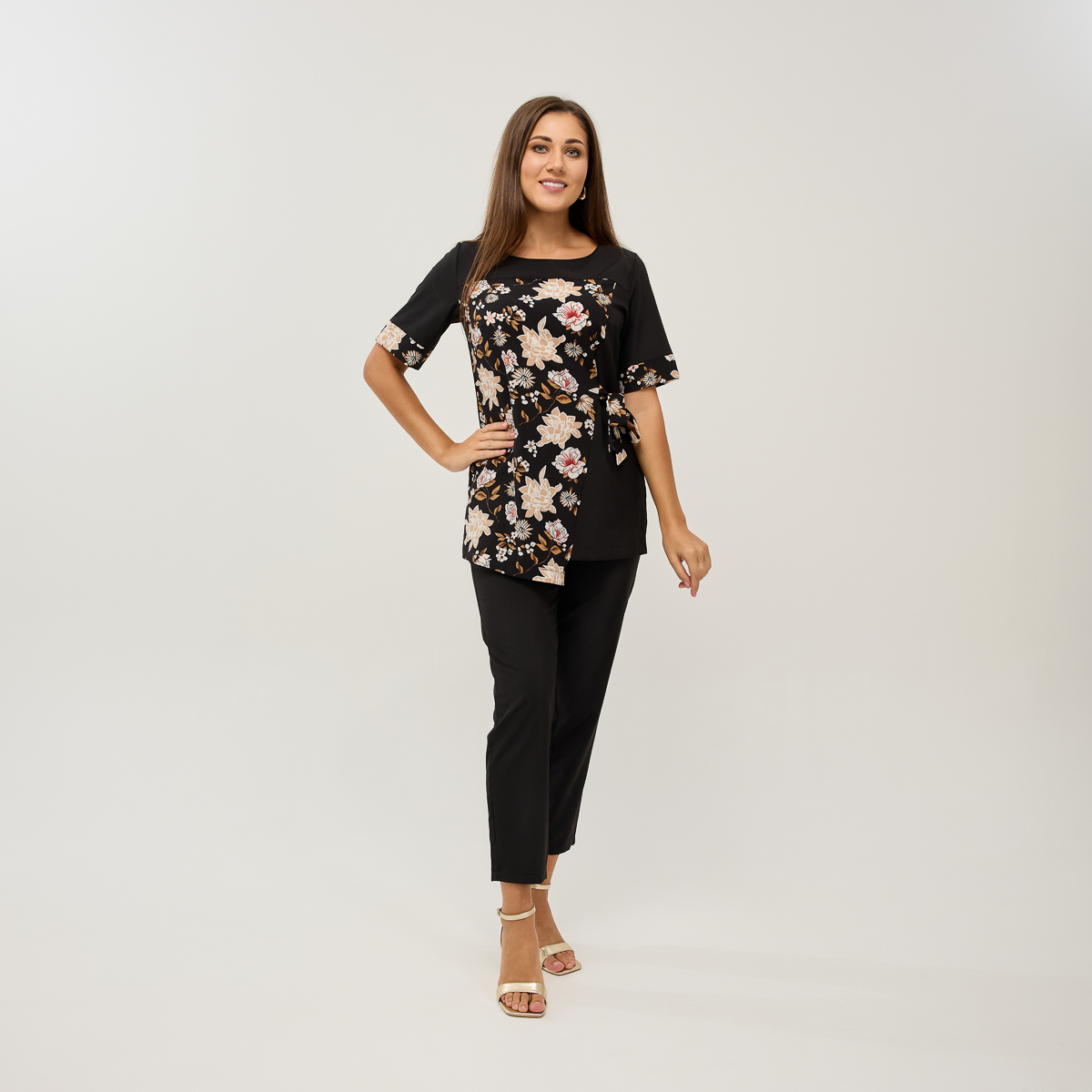 Ребекка - костюм, який миттєво додасть вишуканості вашому образу! Пошитий з неймовірно м'якої та легкої тканини. Унікальний крій блузки підійде для будь-якого типу фігури та підкреслить її жіночу привабливість. Квітковий малюнок додасть свіжості, а скорочені, легко облягаючі брюки з кишенями акцентують увагу на вишуканості ваших ніг.