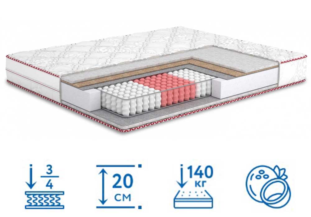 Матрац Four Red Rubin купити в інтернет-магазині Матрац ТБ можна прямо з дому. Двостороння модель висотою 20 см з асиметричною жорсткістю дозволить без зайвих зусиль створити умови для повноцінного нічного сну в будь-який час року. Конструкція заснована на грамотному поєднанні різних наповнювачів з блоком незв'язаних пружин, що відрізняються за ступенем пружності. Таким чином виробнику вдається забезпечити відмінні ортопедичні властивості готової продукції без збільшення її ціни.