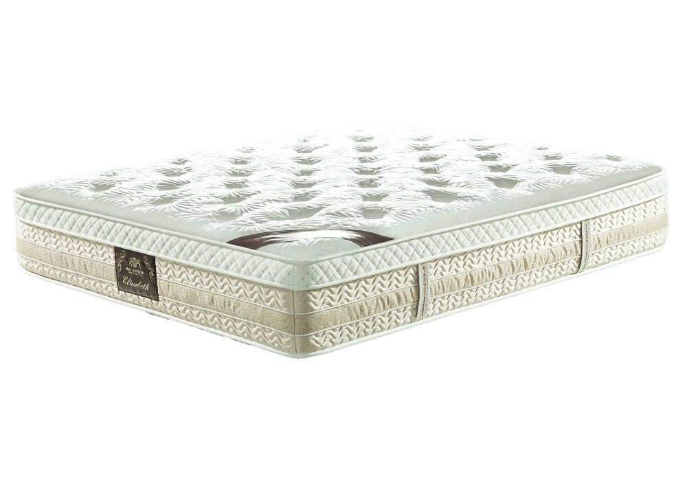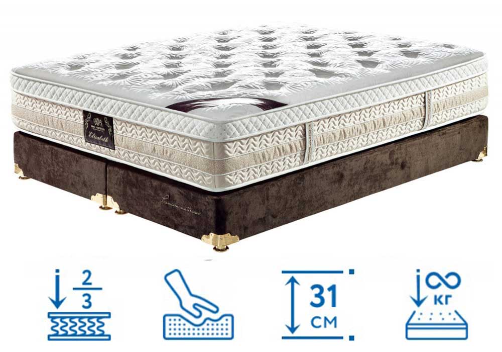Матрац King Mattresses Elizabeth / Елізабет купити в інтернет-магазині Матрац ТБ зацікавлені цінителі розкішного та якісного спального приладдя. Конструктивними особливостями моделі висотою 31 см є збалансоване поєднання наповнювачів та унікальна система підтримки. Інженери МатроЛюкс зуміли створити красивий та практичний матрац з приголомшливими споживчими властивостями. Пристосування має два функціональних боки різного рівня жорсткості, здатне витримати будь-яку вагу.