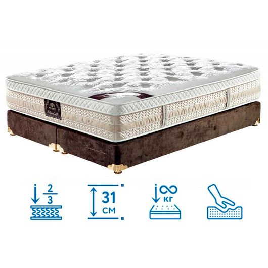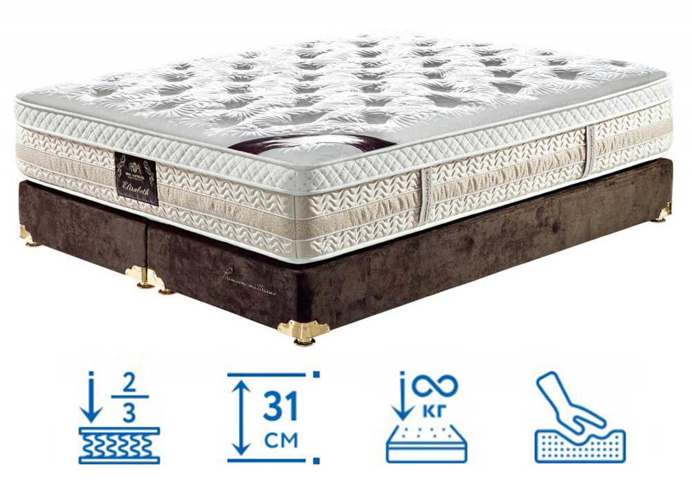 Матрац King Mattresses Elizabeth / Елізабет купити в інтернет-магазині Матрац ТБ зацікавлені цінителі розкішного та якісного спального приладдя. Конструктивними особливостями моделі висотою 31 см є збалансоване поєднання наповнювачів та унікальна система підтримки. Інженери МатроЛюкс зуміли створити красивий та практичний матрац з приголомшливими споживчими властивостями. Пристосування має два функціональних боки різного рівня жорсткості, здатне витримати будь-яку вагу.